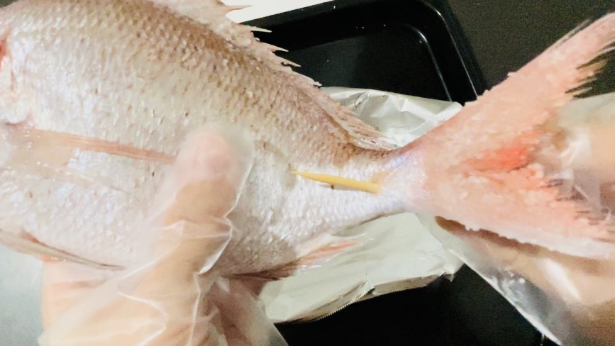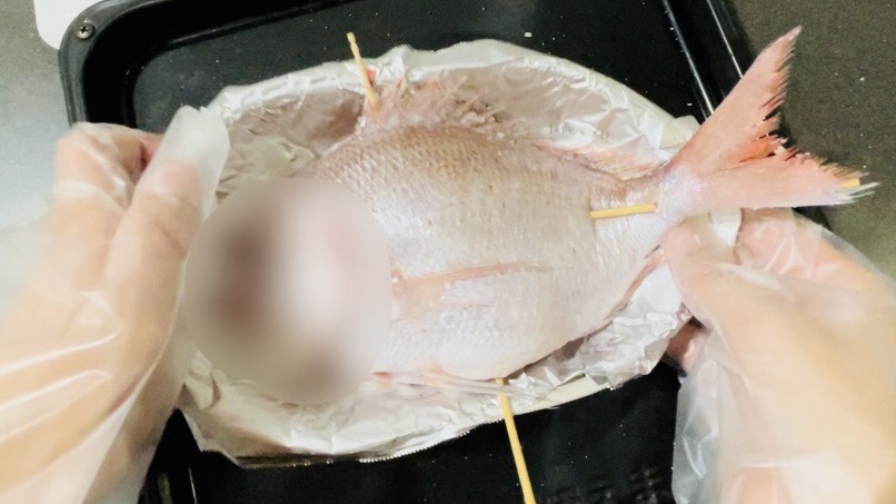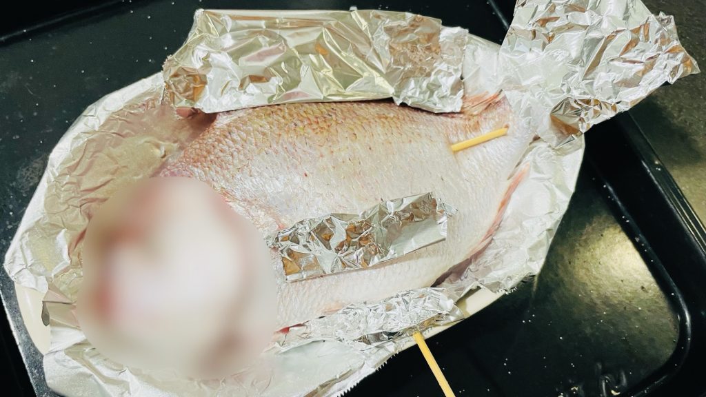 ※鯛のサイズやオーブンによって加減が異なってくるので、ちょこちょこ様子見ながら温度&時間を調整していくのが良さそうです。(ちょっと手間ですが、その方がコゲずに上手く焼けると思います。)